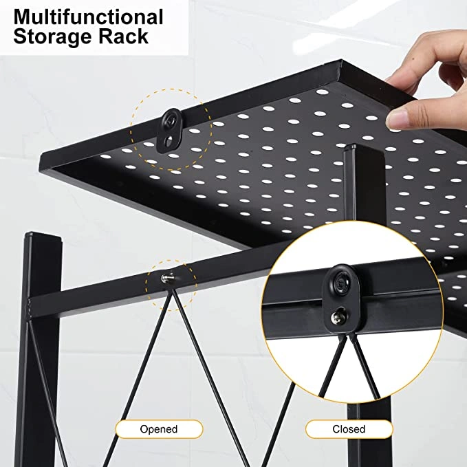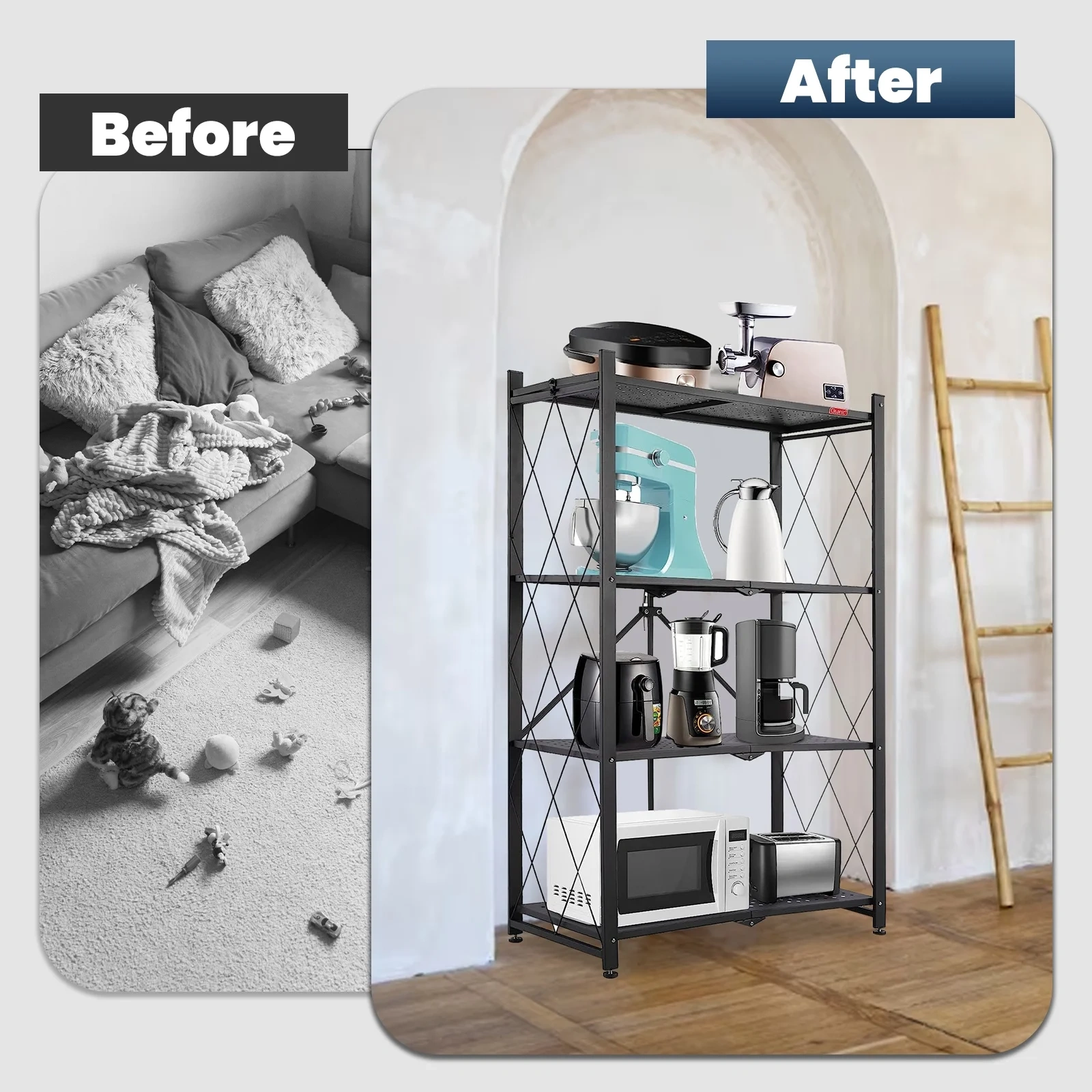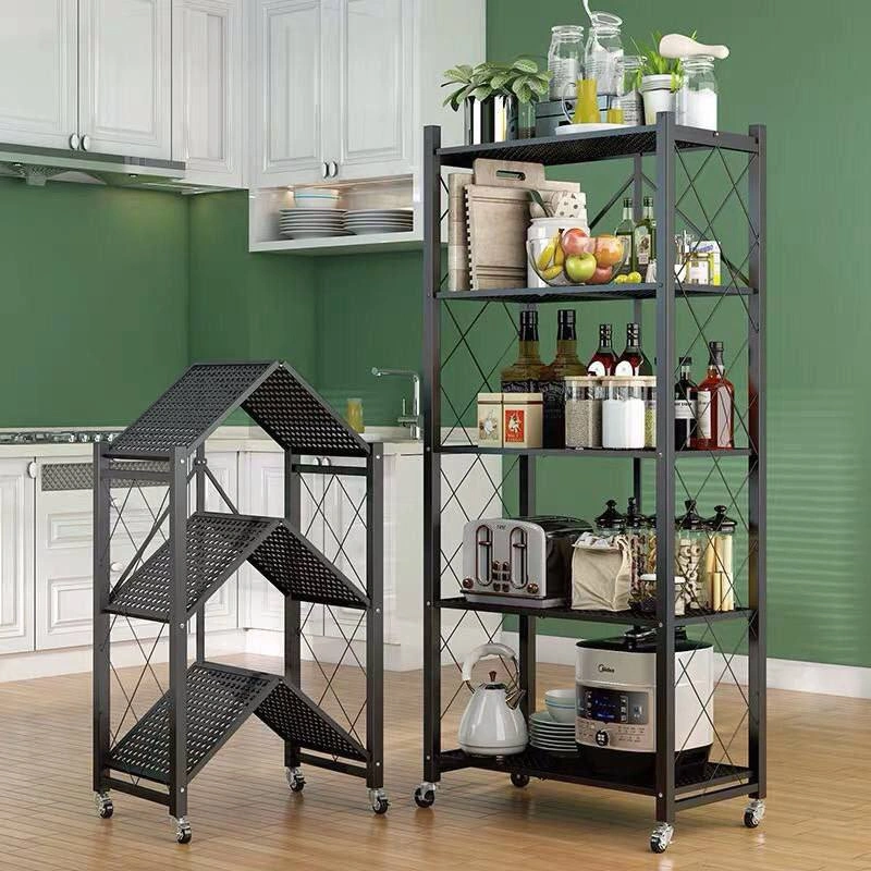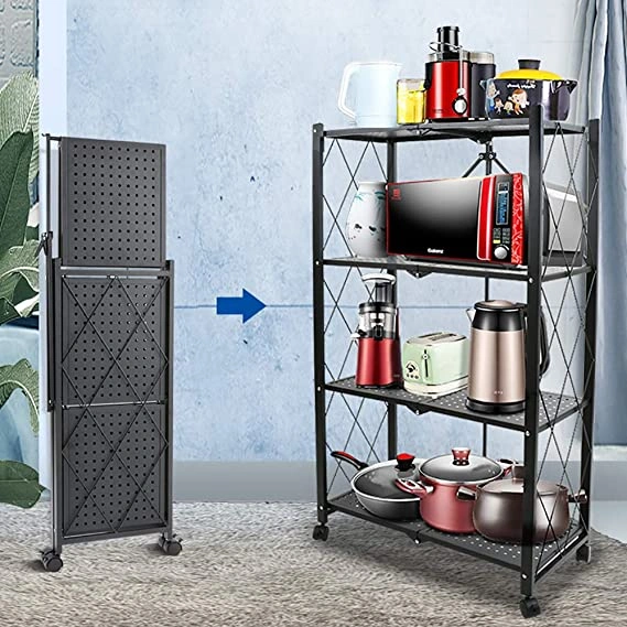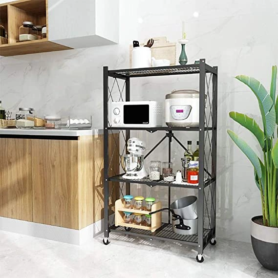 استاند منظم 4 رفوف معدني قابل للطي بعجلات لسهولة الحركة للمطبخ والحمام – Foldable 4 Tier Metal Storage Rack with Wheels for Easy Mobility in Kitchen & Bathroom