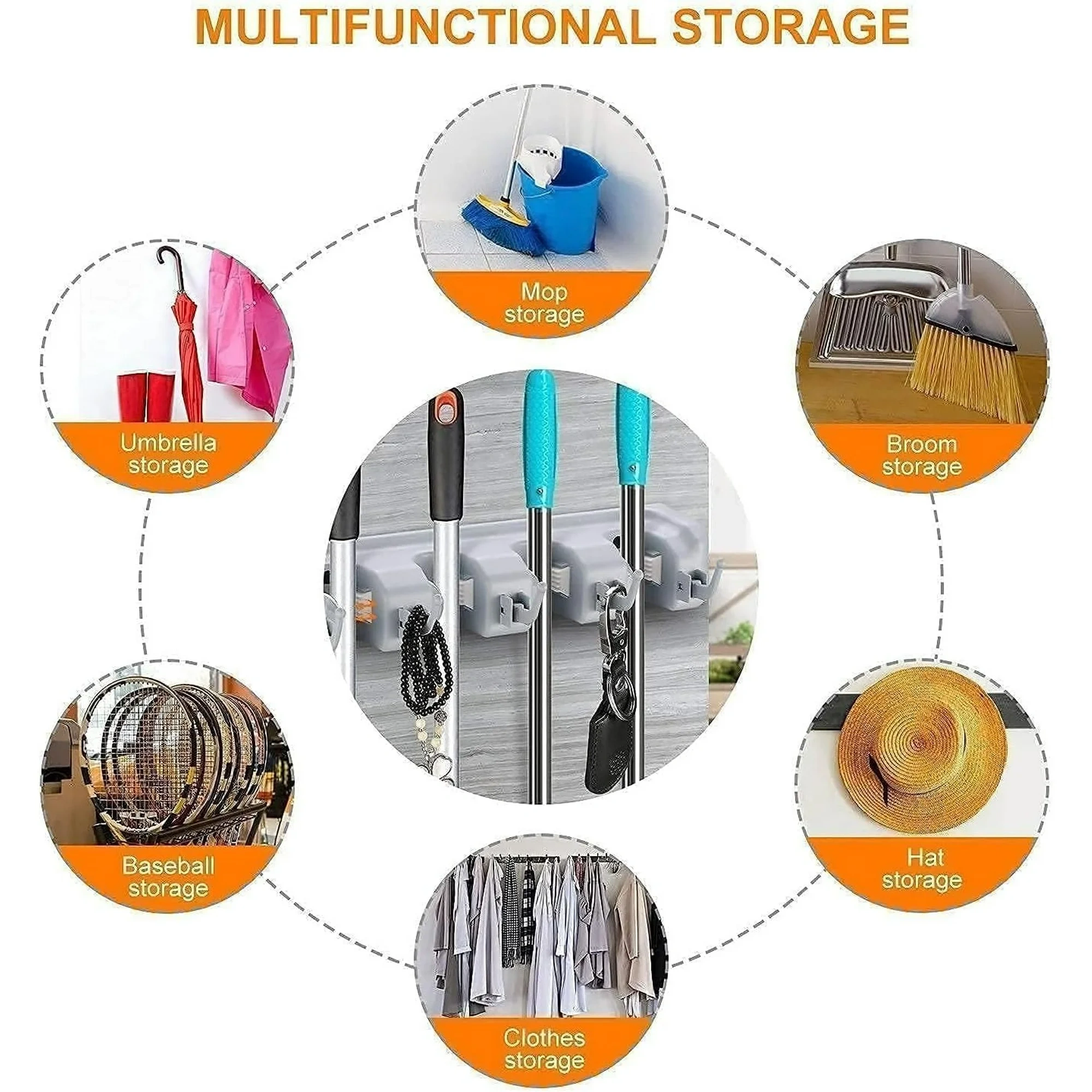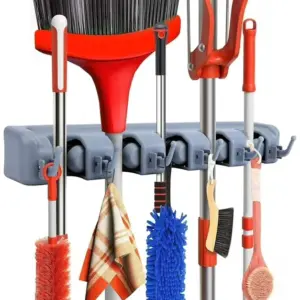 حامل مكانس 5 فتحات مع 6 هوكات لتعليق الفوط والجاروف وتنظيم أدوات التنظيف – 5 Slot Broom Holder with 6 Hooks for Towels, Dustpans, and Cleaning Tools
