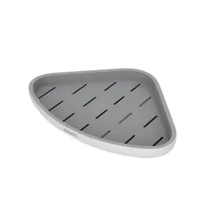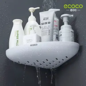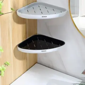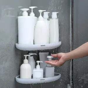 Corner shelf that gathers shampoo, shower gel, and bathroom essentials in one spot